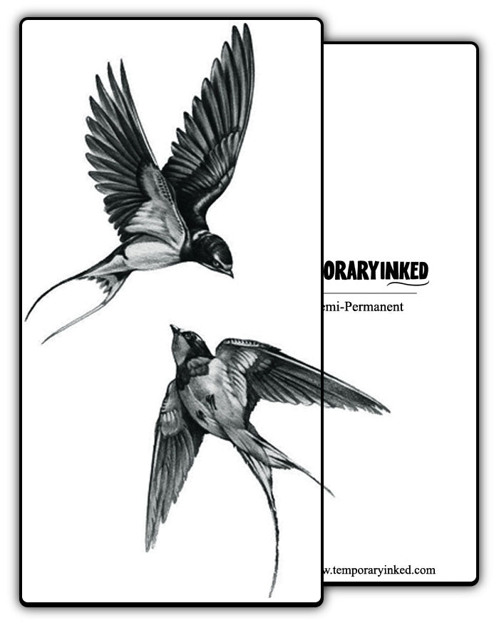 Experience the refined artistry of the 'Aerial Harmony Tattoo,' showcasing two birds in elegant flight with intricate detail, capturing the essence of freedom and movement.