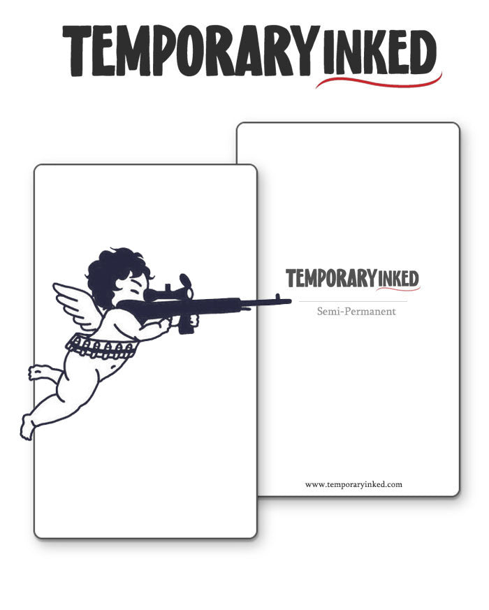 Unleash the warrior within with the 'Combat Cupid Tattoo,' a bold fusion of mythical charm and modern warfare, symbolizing the fierce battles fought in the name of love.