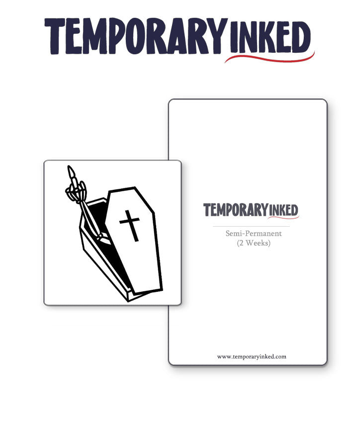 Final FU Coffin Tattoo: A striking design showcasing a coffin with a skeletal hand defiantly giving the finger, symbolizing a fearless attitude toward mortality and a celebration of individuality, perfect for those who embrace their unique spirit with unapologetic confidence.