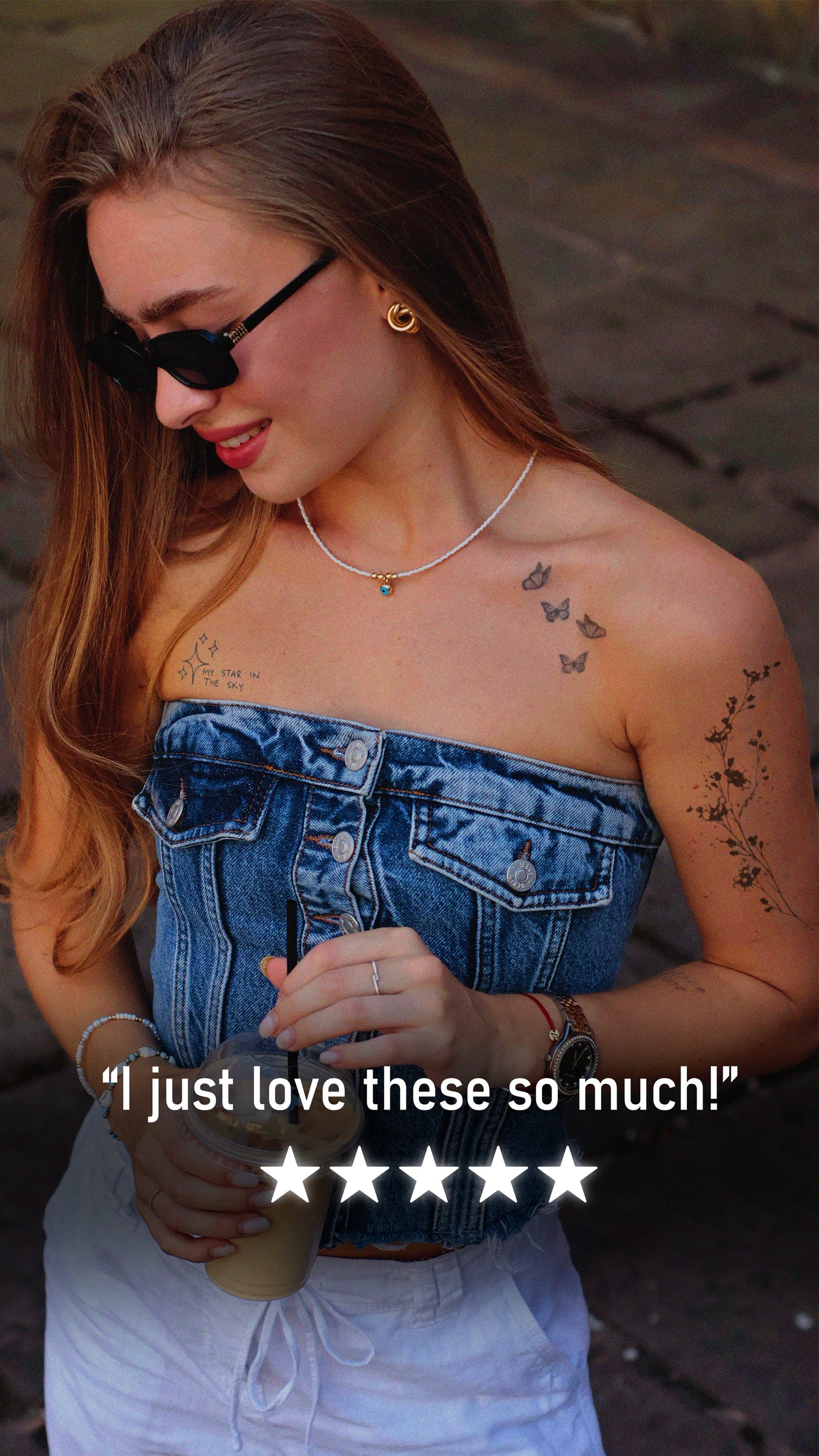 "I am absolutely in love with my new temporary tattoos! The design is minimal yet so stylish. I wore it to the beach, and it stayed on perfectly. Even my friends thought it was real! Definitely ordering more." "I am absolutely in love with my new temporary tattoos! The design is minimal yet so stylish. I wore it... "I am absolutely in love with my new temporary tattoos! The design is minimal yet so stylish. I wore it to the beach, and it stayed on perfectly. Even my friends thought it was real! Definitely ordering more."