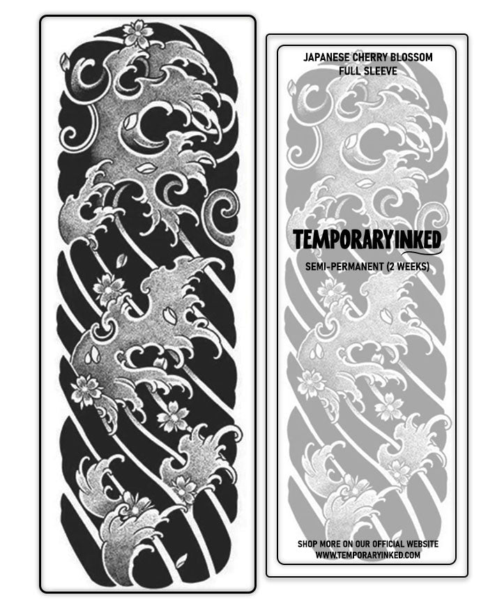Japanese Cherry Blossom Sleeve: "The 'Japanese Cherry Blossom Sleeve' captures the fleeting beauty of sakura blossoms interwoven with elegant waves, symbolizing renewal and the ephemeral nature of life, rendered in a classic Japanese style.