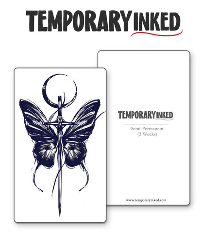 Lunar Wingblade Tattoo: Embrace the mystique of the 'Lunar Wingblade,' a captivating tattoo design that melds the ethereal elegance of butterfly wings with the sleek, sharp allure of a moonlit blade.