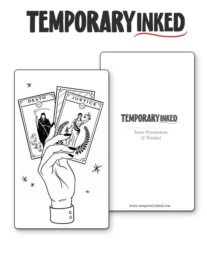 Tarot's Verdict Tattoo: A captivating design featuring a hand elegantly holding the tarot cards of Death and Justice, symbolizing the intertwined themes of fate and morality; perfect for those who embrace the mysteries of life and seek to express their unique journey through the art of tarot.